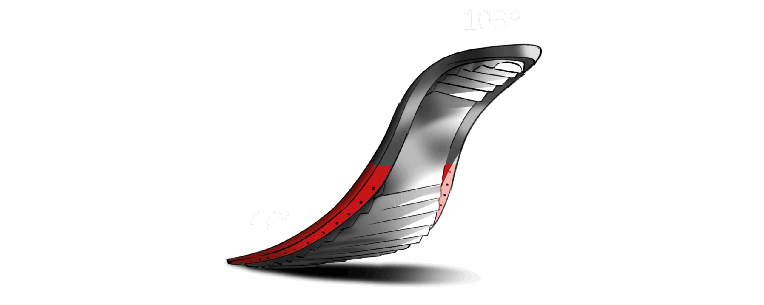 Die patentierte Wellenstruktur mit spezifischen Winkelanordnungen von 77° und 103°ist einzigartig. Sie orientiert sich an der physiologischen Abrollbewegung des Fusses und unterstützt die natürliche Biomechanik des Gehens .